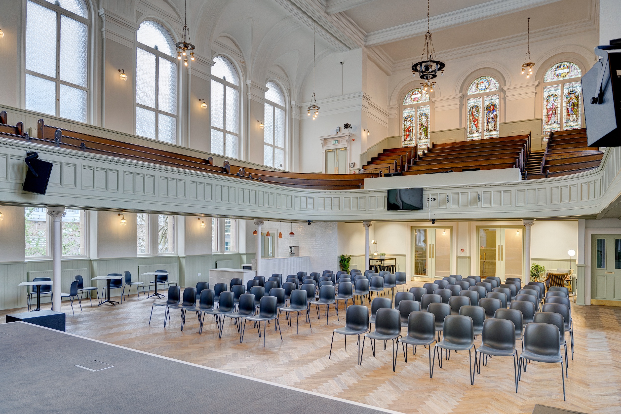 Our auditorium has stood the test of time well! With a high vaulted ceiling and original features from 1877, a full refurbishment complete in March 2023, it can seat 400 people comfortably.